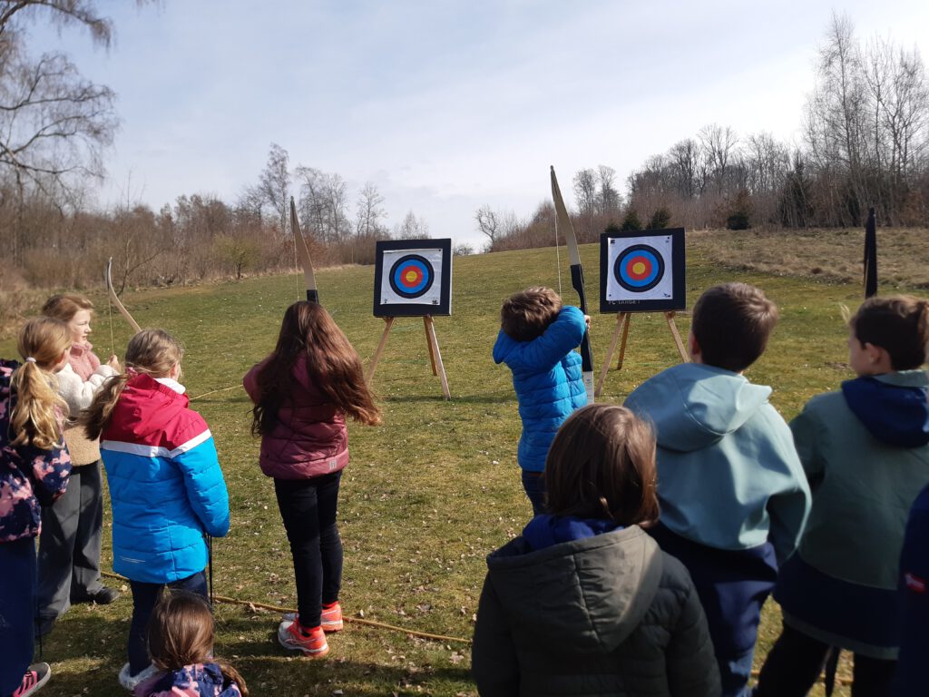 Im Wald bauten wir mit leuchtenden Augen Zwergenhäuser aus Moos, Ästen und Steinen und entdeckten dabei unsere Kreativität. Beim Bogenschießen feuerten sich die Kinder gegenseitig an – jeder Treffer wurde begeistert gefeiert. Abends ließen wir den Tag gemütlich am Lagerfeuer mit Stockbrot ausklingen.